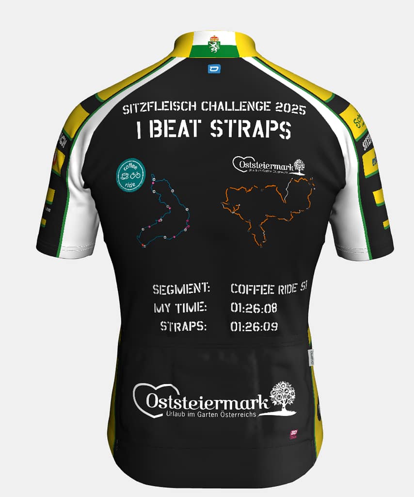 Jeder Teilnehmer, welcher ein Segmente schneller als Christoph absolviert hat, erhält von unseren Sponsoren ein personalisiertes Sitzfleisch Dress „I BEAT STRAPS“ mit den Vergleich Zeiten als Anerkennung der Leistung.